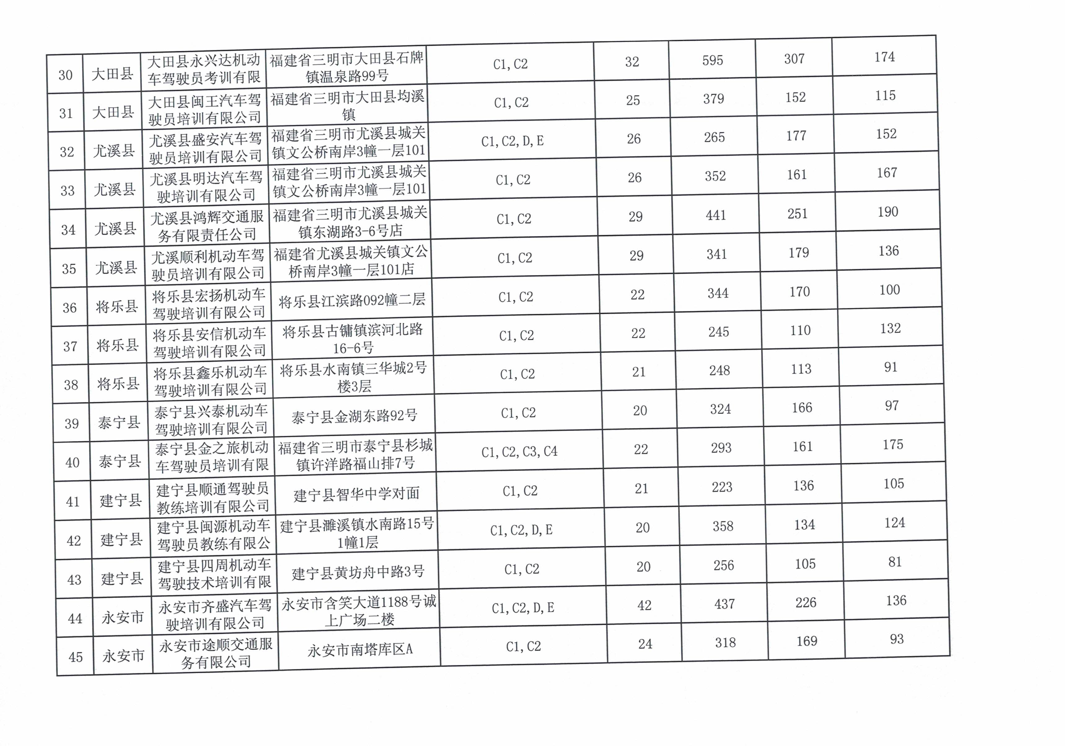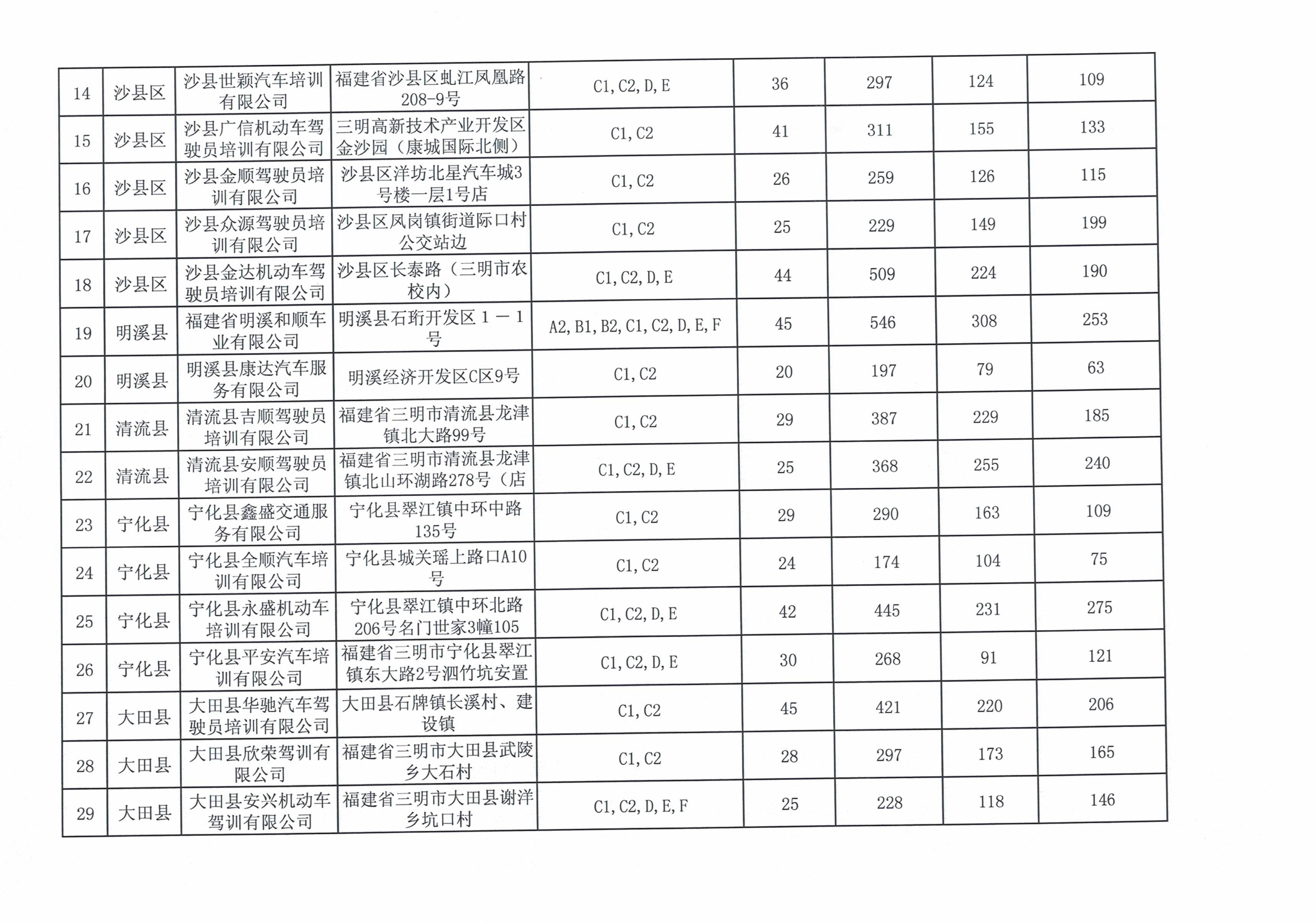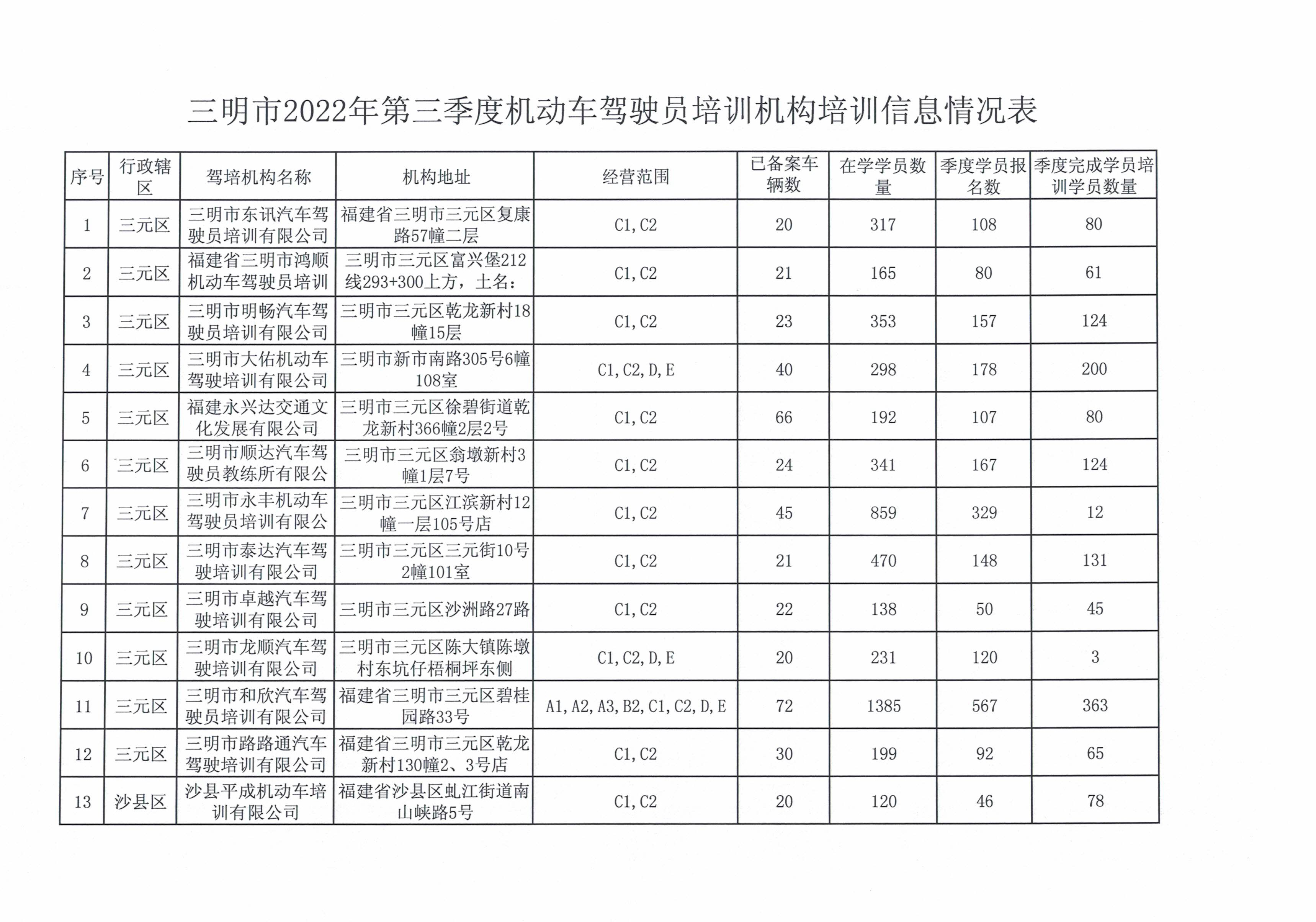 三明市2022年第三季度机动车驾驶员培训机构培训信息情况表