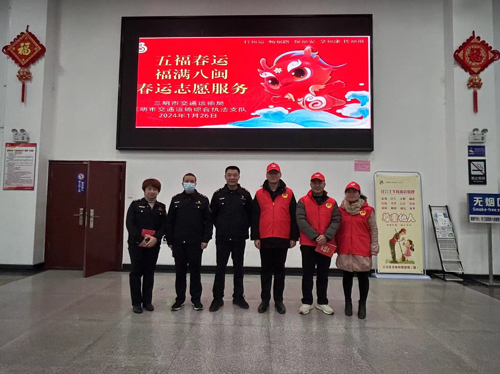 1月26日,局机关、市委文明办联合市交通运输执法支队到客运南站开展“五福春运 福满八闽”志愿服务。志愿者们为来往旅客提供咨询引导、便民便利、秩序维护、安全宣传等暖心志愿服务,为过往旅客提供“安全、舒适、便捷”的春运出行保障。